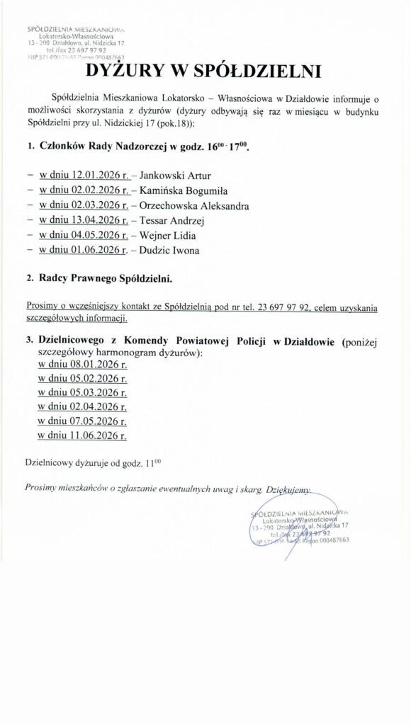 DYŻURY W SPÓŁDZIELNI